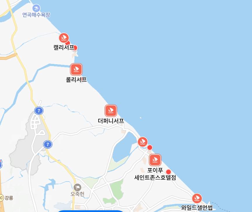안목해변은 강릉에서 가장 유명한 서핑 스팟으로, 초보자들이 안전하게 서핑을 배우기에 최적화된 조건을 갖추고 있습니다. 파도의 높이가 적당하고 해변의 경사가 완만해 처음 서핑을 배우시는 분들께 특히 추천드립니다.