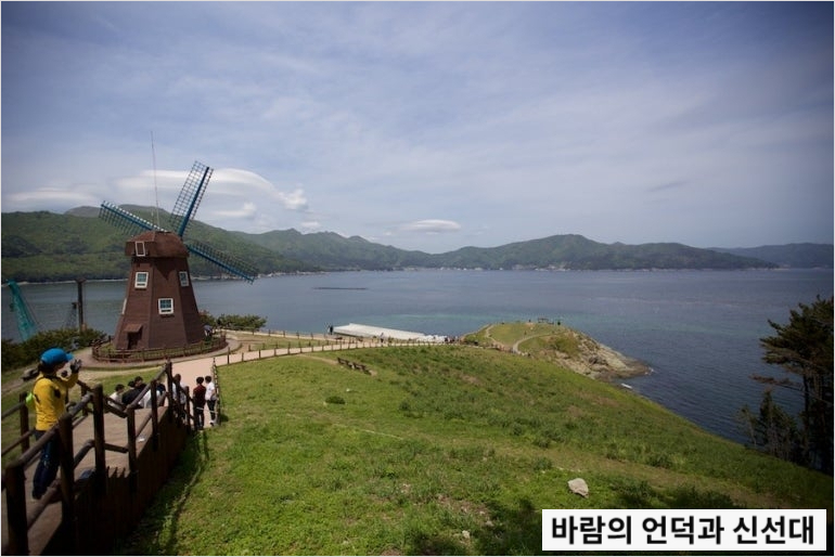 바람의 언덕에서는 한려해상국립공원의 아름다운 섬들과 도장포 마을의 평화로운 풍경을 한눈에 조망할 수 있습니다. TV 드라마 '이브의 화원', '회전목마', 예능 프로그램 '1박 2일' 등의 촬영지로도 유명해 많은 관광객들이 찾는 필수 코스입니다.