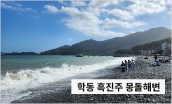 거제도 여행의 첫 번째 추천지는 바로 학동 흑진주 몽돌해변입니다. 이곳은 모래사장이 아닌 검은색 조약돌로 이루어진 독특한 해변으로, 거제 9경 중 하나로 손꼽히는 명소입니다.