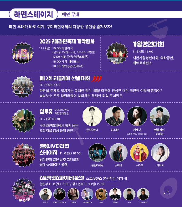 2025 구미라면축제, 구미라면축제 일정, 라면 스트리트 475, 세상에서 가장 긴 라면 레스토랑, 구미역 라면축제, 데몬 헌터스 콜라보, 케데헌 면치기 대회, 신라면 케데헌 한정판, 갓 튀긴 라면 메뉴, 반띵라면, 후루룩 라운지, 라면 피크닉, 구미라면홍보관, 구미라면스테이션 475, QR 주문 시스템, 금오산 키즈 페스티벌, 금리단길 라면 이벤트, 구미형 도시 페스티벌, 로컬 푸드 캠페인, 라면 MBTI, 무소음 DJ파티